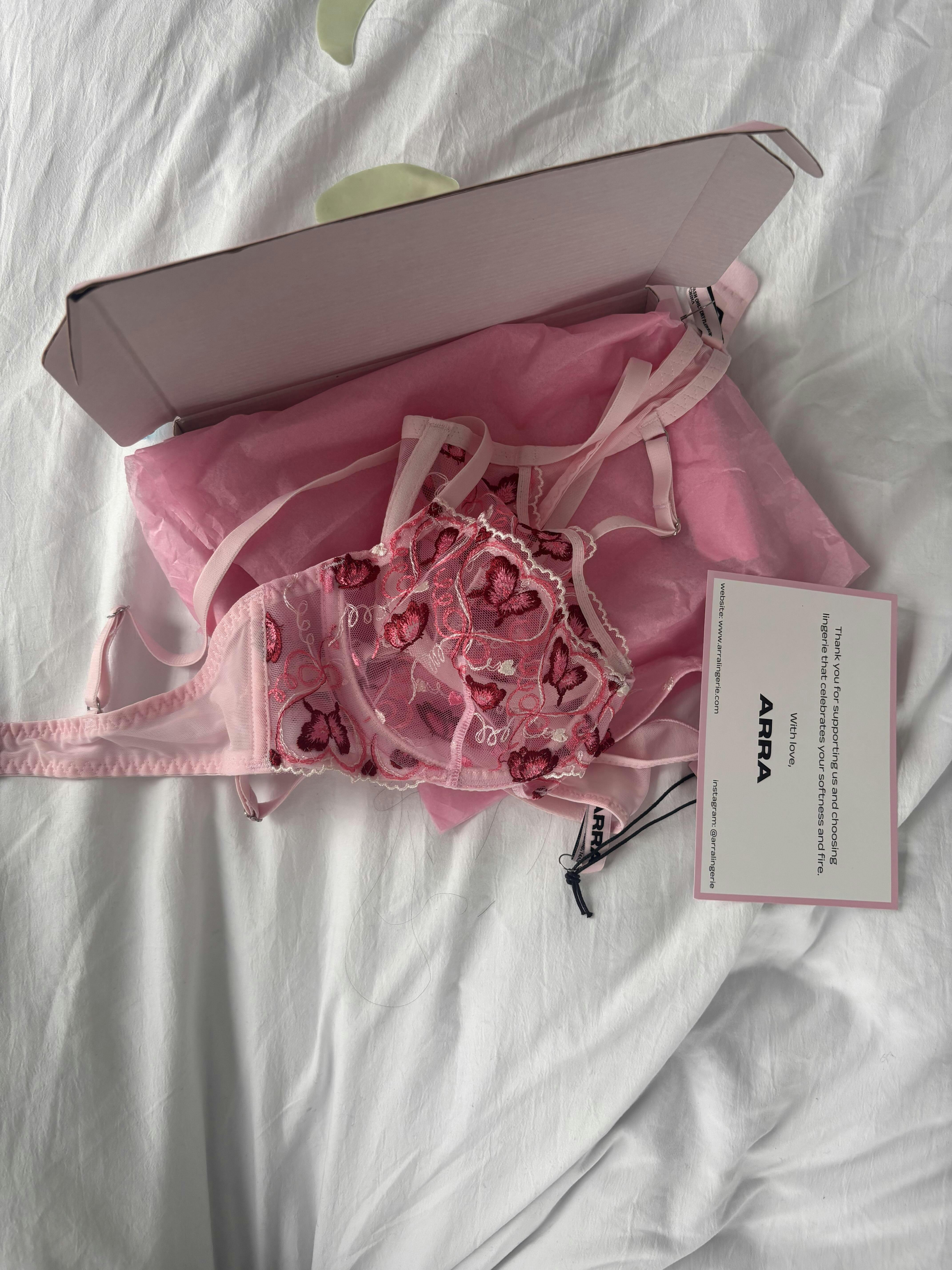 Flutter Me is crafted in sheer blush tulle, delicately embroidered with soft butterfly motifs that seem to land where eyes linger most. Designed to feel like second skin, this set flirts with elegance and innocence and leaves a lasting impression.